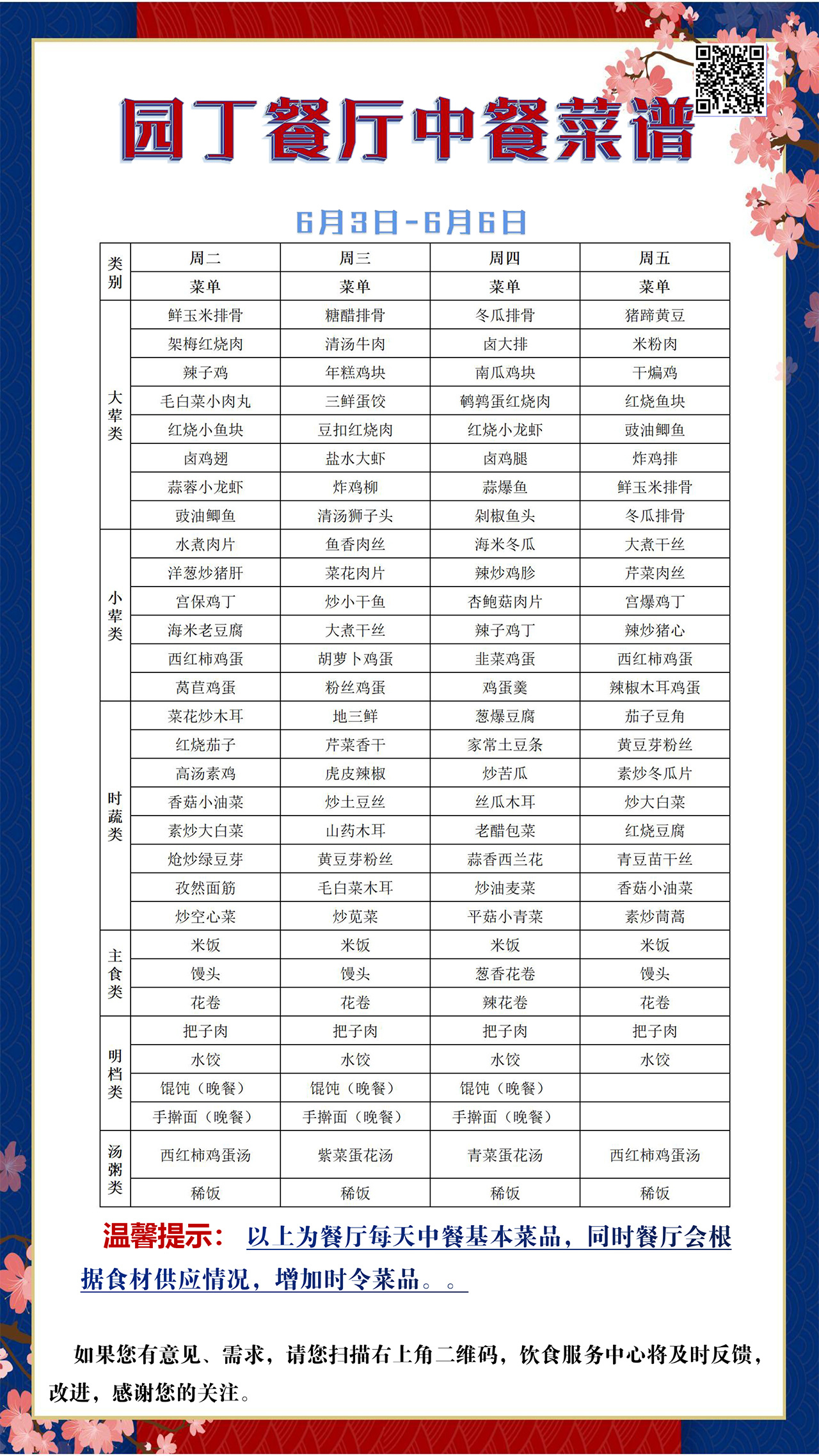 根据大数据分析,餐厅11:25-11:35、11:45-11:50、12:00-12:05三个时间段为就餐高峰期,为了减少排队等待时间,老师们可以选择错峰就餐。餐厅所有食材当天购买、当天使用,菜品新鲜,安全卫生。