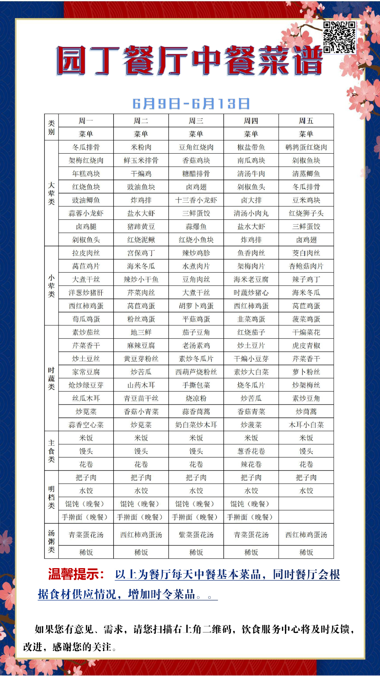 根据大数据分析,餐厅11:25-11:35、11:45-11:50、12:00-12:05三个时间段为就餐高峰期,为了减少排队等待时间,老师们可以选择错峰就餐。餐厅所有食材当天购买、当天使用,菜品新鲜,安全卫生。