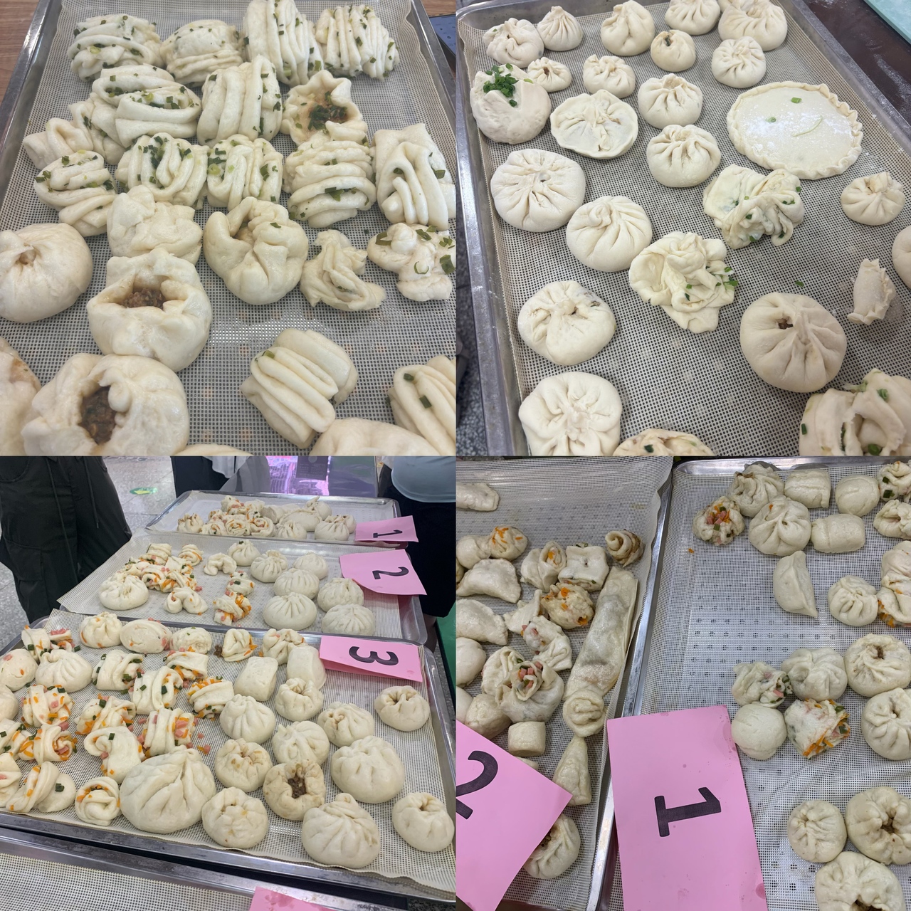“开锅啦!”一阵欢呼响起,在同学们热切目光的注视下,指导老师从食堂后场推出蒸笼推车,热腾腾的蒸汽扑面而来。待雾气散去,白白胖胖的馒头、形态各异的花卷、大小不一的包子映入眼帘。同学们迫不及待地在成果展示区里搜寻自己的“作品”,脸上写满了自豪与喜悦,食堂内顿时充满了欢声笑语。看似简单的馒头花卷,此时仿佛被赋予了别样的甘甜——那是汗水浇灌出的劳动滋味,是亲手创造带来的满足感。