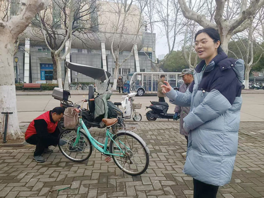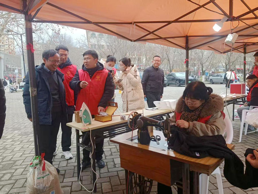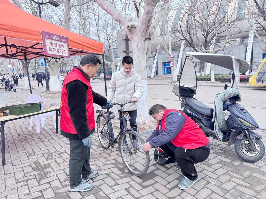 在自行车维修保养服务点,志愿者们手法娴熟、一丝不苟,为师生的自行车逐一充气,细致检查轮胎、刹车、链条等部件的状况,及时排查并处理各类潜在安全隐患,用专业与严谨守护师生的出行安全,让每一辆自行车都能“安心上路”。衣物缝补服务点前,后勤的阿姨们脚踩缝纫机、飞针走线,为同学们缝补破损衣物、修补开线裤脚,看似琐碎的小事,却饱含着浓浓的关爱,细密的针脚不仅缝合了衣物的裂痕,更让同学们感受到了校园大家庭的温暖。